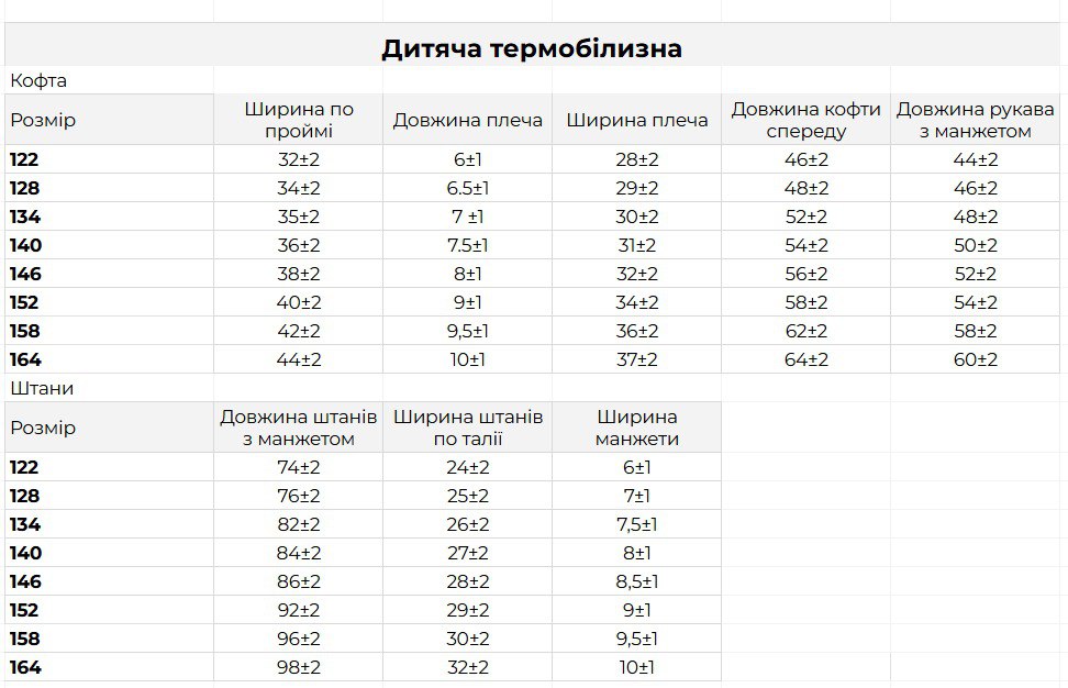 Нижче ви можете переглянути детальні заміри для дітячої термобілизниі.
