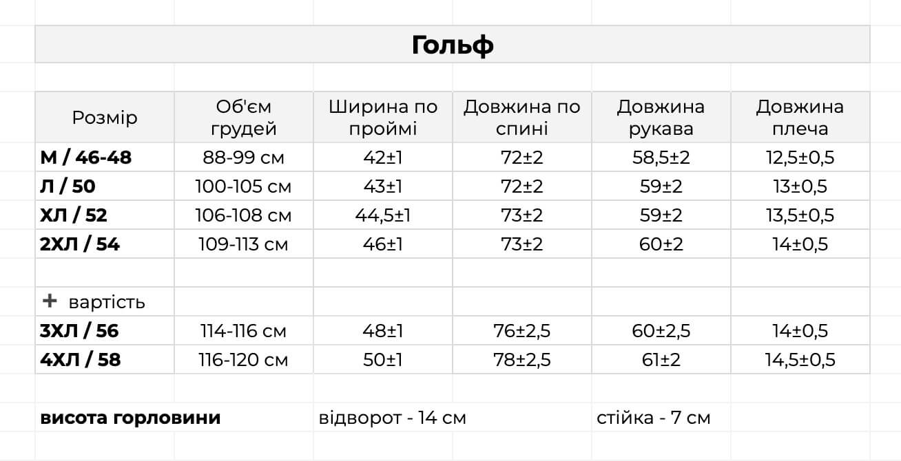 Нижче ви можете подивитись детальні виміри для чоловічого трикотажного гольфу.