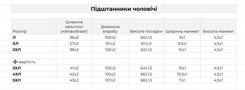 Нижче ви можете подивитися детальні заміри для чоловічих кальсонів.