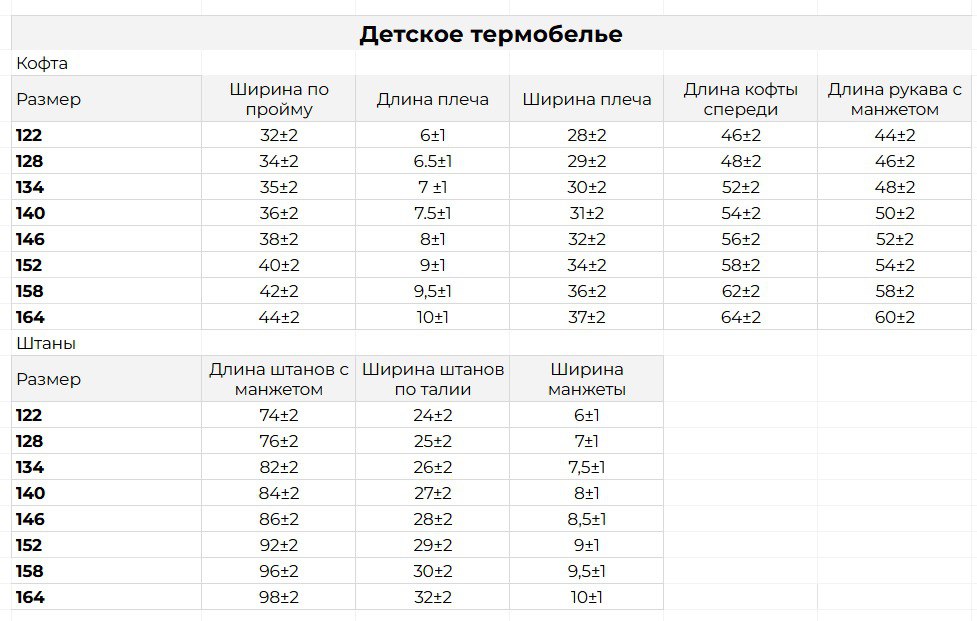 Ниже вы можете просмотреть подробные замеры для детской термобелья.