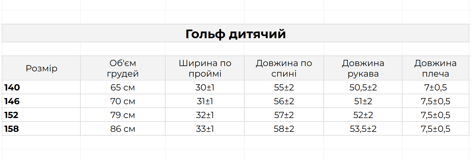 Нижче ви можете подивитися детальні заміри для дитячого трикотажного гольфу для хлопчиків.
